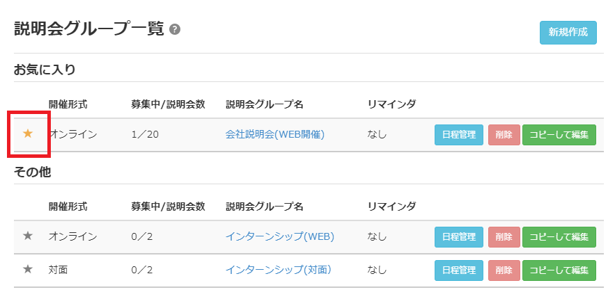 ※新しく説明会グループを作成した場合は、すべて「その他」に登録されます。