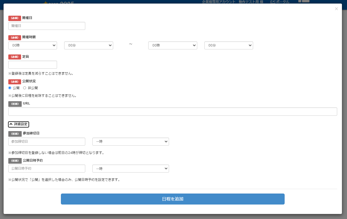※日程を公開した後に当該日程を「削除」「編集」することはできません。