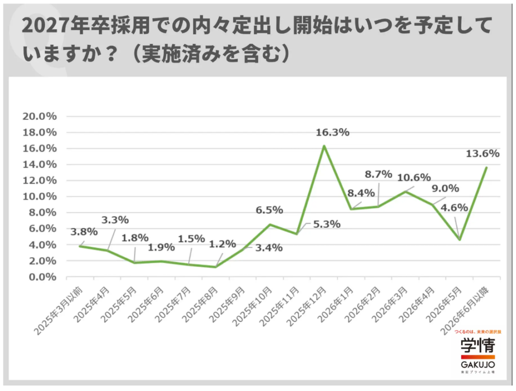 参考:株式会社学情(4)2027年卒採用の内々定出し開始予定は「2025年12月」が最多。年内開始の企業が45%