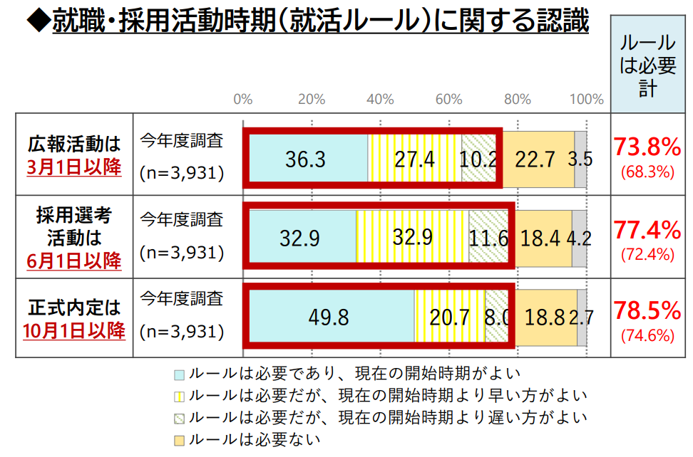 厚生労働省が実施している学生向けアンケート調査によると、採用活動時期の就活ルールが必要と回答する割合が多い一方で「現在の開始時期よりも早い方が良い」「ルールは必要ない」と回答している学生も多いことが分かります。