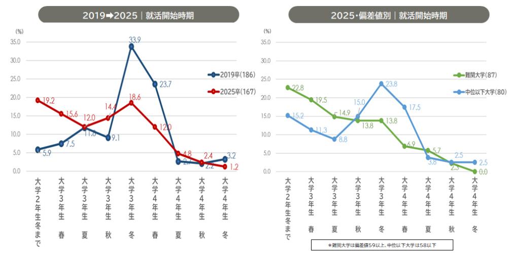 パーソル総合研究所の調査によると、就活を開始する時期について、2019年は「大学3年生冬」になると一斉に動き出すのに対して、2025年は「大学2年生冬」までに既に2割が就活を開始していることが分かります。さらに大学偏差値別でみると、難関大学では早期から活動を開始する就活生が多い傾向にあります。