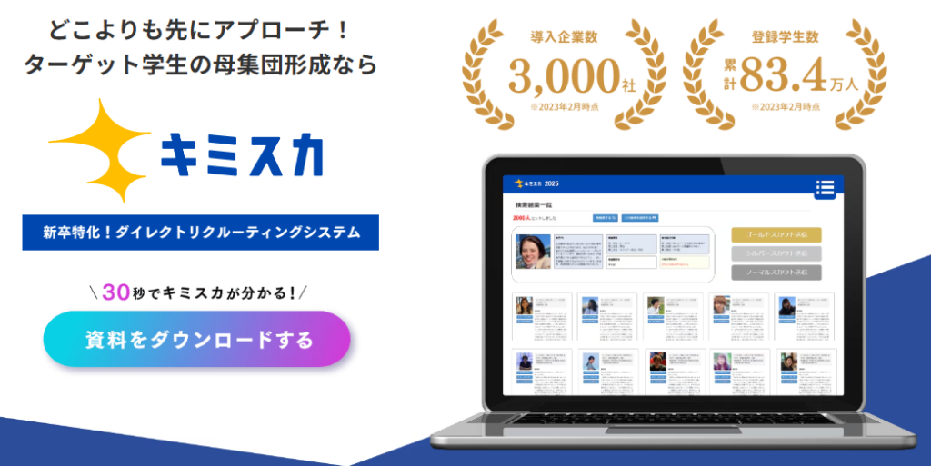 弊社が運営している「キミスカ」は、就活生の3人に1人が活用するダイレクトリクルーティングシステムです。3種類のスカウトを活用して、工数を削減しながら効率的にターゲット学生との接点を増やすことが可能です。デモ画面もご覧いただけますので、ぜひこちらからお気軽にご連絡ください。
